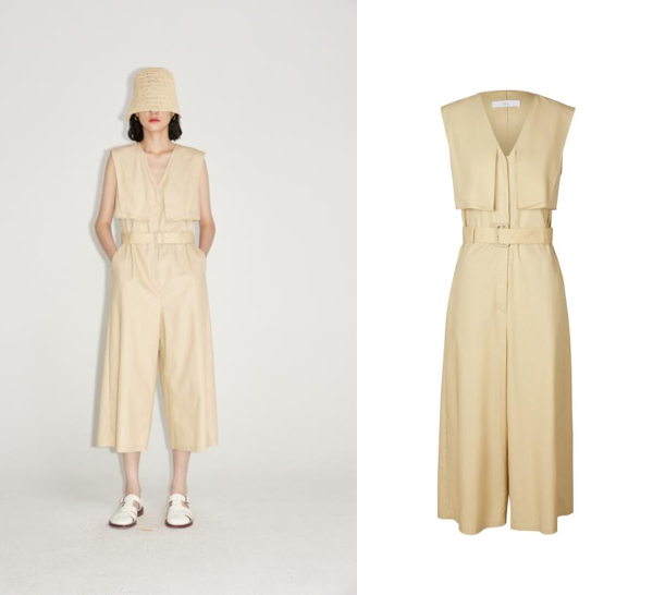 纯色连体衣运用全棉强捻双面斜纹布制作,融入猎装细节,前片运用挡风片装饰,使衣身线条更为有型,呈现高腰的效果,展现优雅身材比例和干练风格;下装阔腿裤修饰腿型的同时,凸显自信气场。